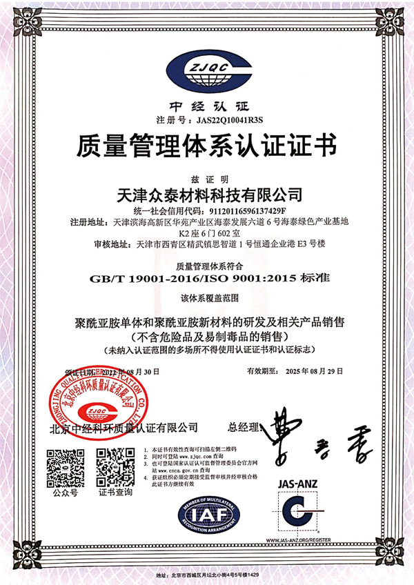 天津眾泰材料科技有限公司(以下簡稱“眾泰”),是一家“以先進(jìn)功能性聚酰亞胺單體研發(fā)生產(chǎn)為核心,致力于推動全球聚酰亞胺材料產(chǎn)業(yè)發(fā)展”為使命的創(chuàng)新型高新技術(shù)企業(yè)。眾泰研制的聚酰亞胺單體目前已廣泛應(yīng)用于無色透明柔性聚酰亞胺薄膜、柔性顯示材料、5G新材料等諸多高科技領(lǐng)域產(chǎn)品的生產(chǎn)。